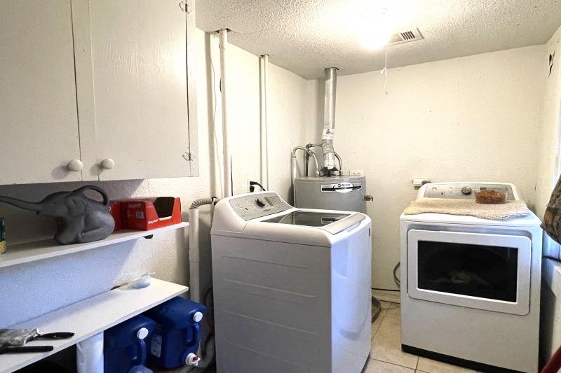 Very cute 2 bed, 1 bath, frame house with central h&a & metal roof, big lot with mature trees, lovely covered side porch, fenced back yard, privacy fence on 3 sides & chain link on 1 side with double gate & walk thru gate, storage bldg included, black top driveway and brick sidewalk to front door, eat in kitchen with gas cook stove and refrigerator included, separate laundry room with washer & dryer included, kitchen & bath with ceramic tile, carpet in bedrooms, metal roof, central h & a installed in 2005 (gas heat), exterior painted in 2018, detached carport and shop area, no survey available, city services.